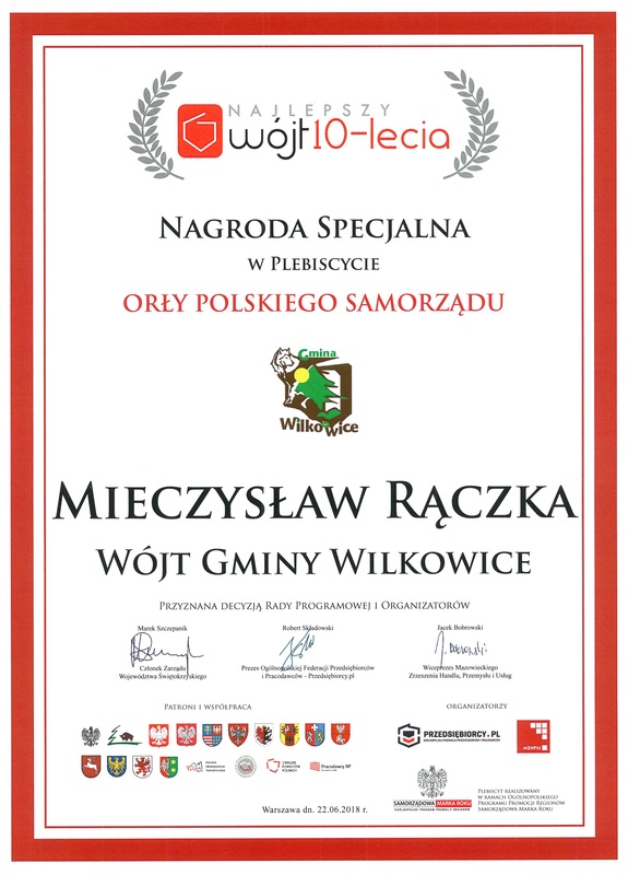 W tym roku Kapituła Rady Programowej uhonorowała również gospodarza Gminy Wilkowice Wójta Mieczysława Rączkę przyznając prestiżowy tytuł NAJLEPSZY WÓJT 10-LECIA za liczne sukcesy w działalności samorządowej, dbałość o rozwój gminy na wielu płaszczyznach oraz za budowanie pozytywnego wizerunku Gminy Wilkowice na przestrzeni minionych 10 lat.